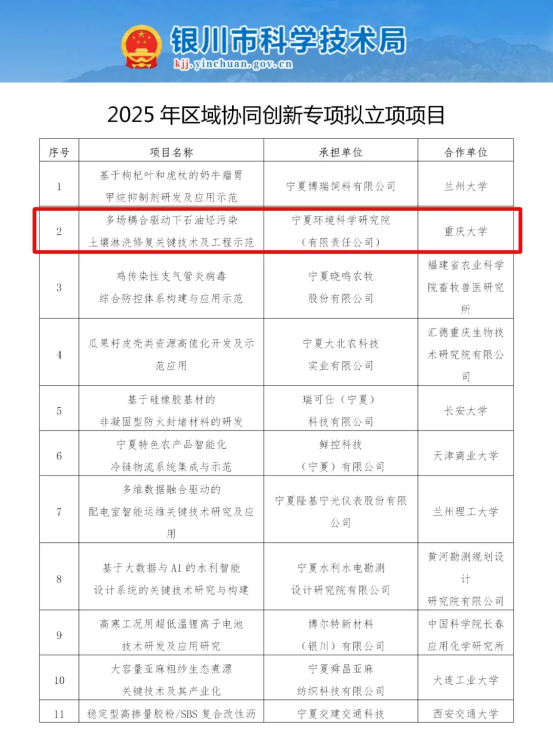 喜訊!近日,昆頂環(huán)保聯(lián)合寧夏環(huán)科院、中國石油天然氣股份有限公司長慶油田分公司第三采油廠、重慶大學、寧夏大學申報的“多場耦合驅(qū)動下石油烴污染土壤淋洗修復關(guān)鍵技術(shù)及工程示范”項目,成功入選2025年銀川市科技局首批科技計劃項目。